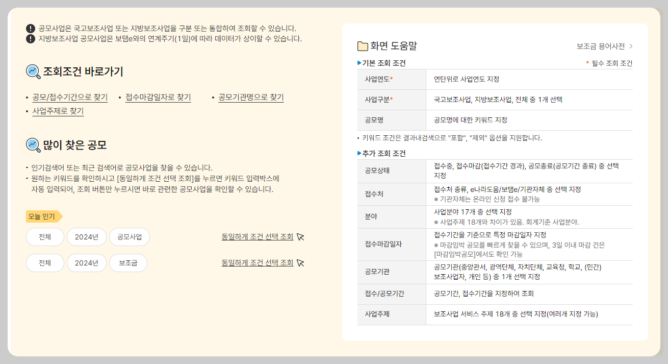 이용할 수 있습니다. 국고보조금 관련 고객상담센터는 1670-9595이며, 지방보조금 관련 문의는 1660-1390으로 문의하시면 됩니다.